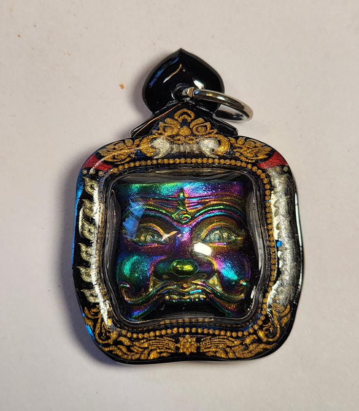 This exquisite piece of Leklai jewelry features a beautifully crafted face design encased in an ornate frame. The Leklai itself is multicolored, displaying a range of vibrant hues that shift and change according to the energy field of the wearer. This unique piece not only serves as a stunning accessory but also as a source of powerful spiritual energy.